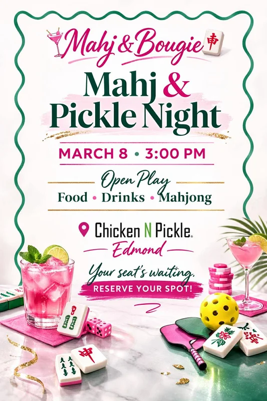 It’s officially happening. Our first Mahj & Bougie Open Play is here and you’re invited to the table. Join us at Chicken N Pickle in Edmond for an afternoon of American Mahjong, laughter, and connection in the OKC metro. This is open play, which means you already know how to play and are ready to shuffle up, call Charleston, and play multiple rounds with other Mahj girls. Expect guided table assignments so everyone feels included, chic vibes, friendly competition, and food and drinks available from Chicken N Pickle. Please bring your current 2025 NMJL card. You are welcome to bring your own tiles if you prefer. Whether you’re a regular at the table or building confidence, this is your chance to grow your Mahjong circle and connect with other Oklahoma Mahjong players. Seats are limited, so reserve your spot and join the table. Your seat’s waiting. 🀄💋